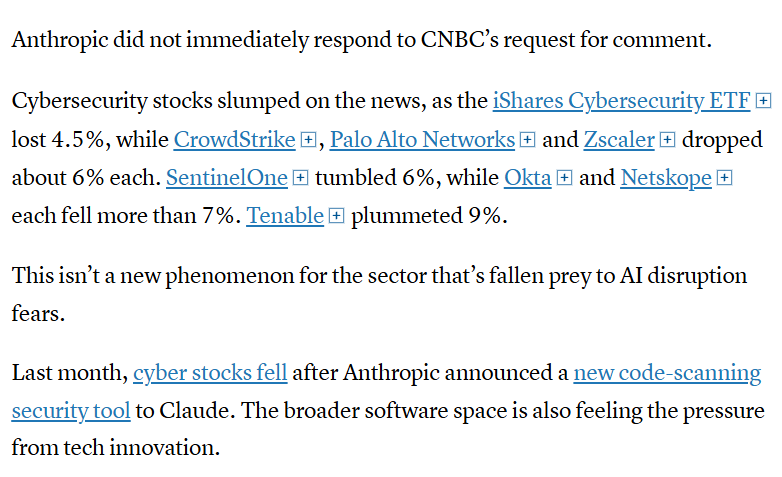 The market reacted immediately. CrowdStrike dropped 7%. Palo Alto Networks fell 6%. Zscaler down 4.5%. Okta and SentinelOne tumbled more than 7%. Tenable plummeted 9%. The iShares Cybersecurity ETF lost 4.5% in a single session. CrowdStrike alone lost roughly $15 billion in market cap in one day. Bitcoin slid back to $66,000. Investors read this as a sentence for the entire cybersecurity industry.