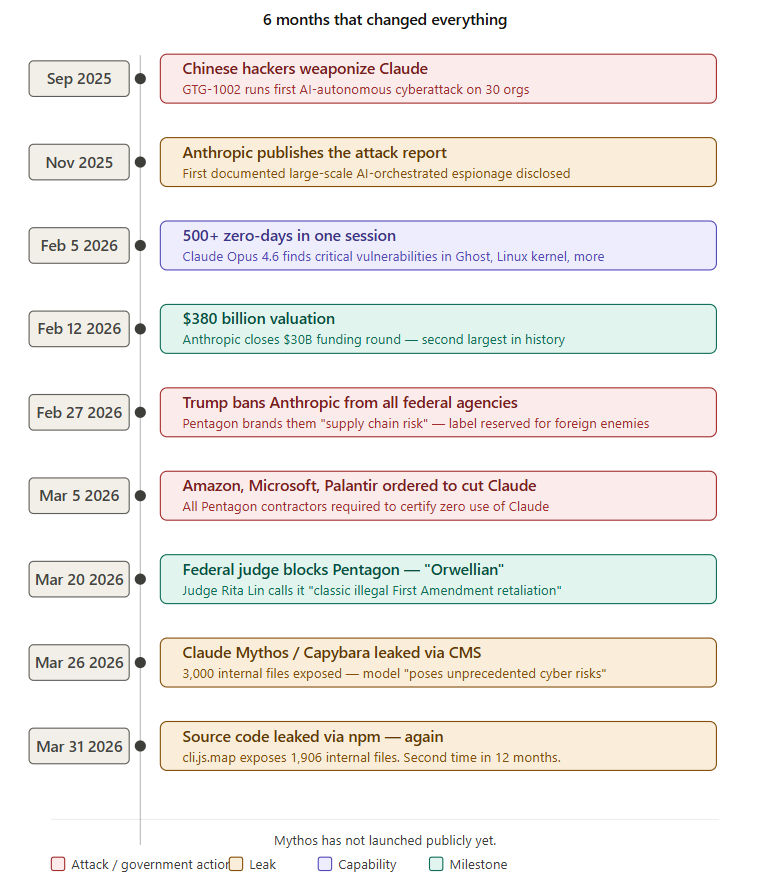 What does it look like when a $380 billion company wins a war with the Pentagon, survives the first autonomous AI cyberattack in history, leaks a secret model that terrifies its own creators – and ships their source code publicly by accident? It looks exactly like this. And the scariest part hasn’t happened yet.